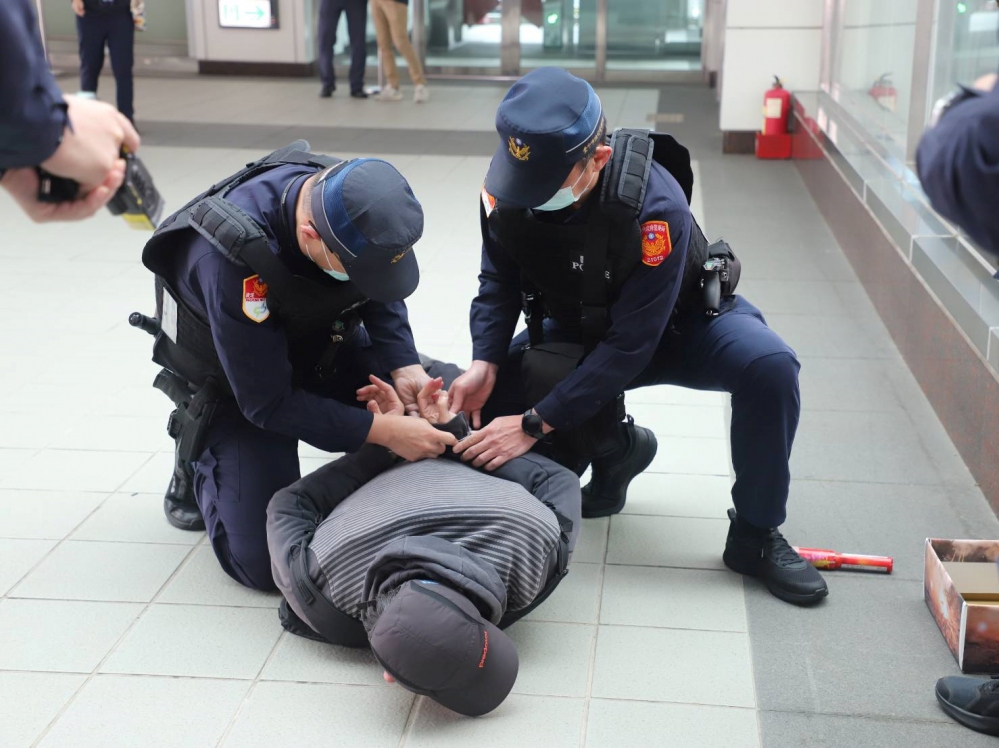 中捷副總經理鄭凱祥指出,此次演練規劃兩大場景,考驗第一線人員面臨不同緊急事件的危機處理能力。第一個演練為「失控的旅客在北屯總站天橋上燃放爆竹並持刀揮舞,造成數名旅客受傷」。