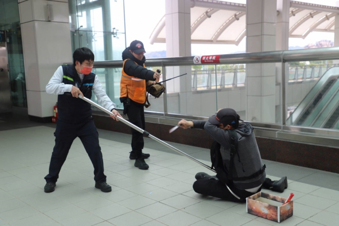 站長隨後手持防爆鋼叉趕抵天橋,與保全一同和行為異常旅客對峙並限制其行動,後續捷警、轄區警察獲報馳赴現場共同壓制行為異常旅客,救護車也抵達將受傷旅客送醫。