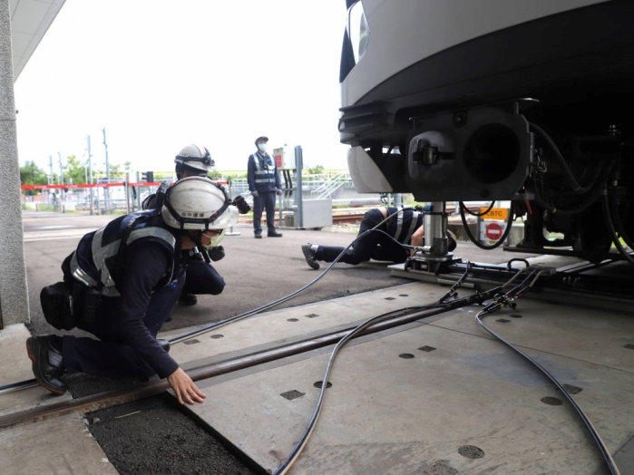 第二個演練則是「列車因地震引發火災及出軌」。災害發生現場人員立即通報行控中心,搶修人員迅速到場執行軌道區斷電作業及初步滅火,在消防人員抵達現場撲滅火勢後,搶修人員即使用復軌設備將列車復歸原位,並確認除列車,軌道、電纜及號誌信標等設備皆正常,恢復正常營運。