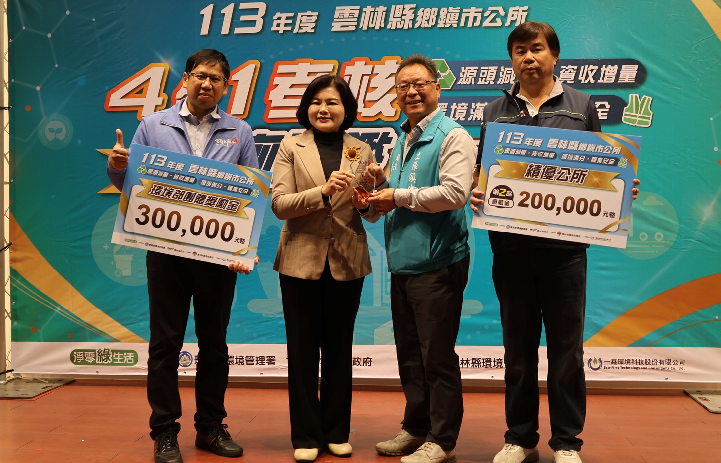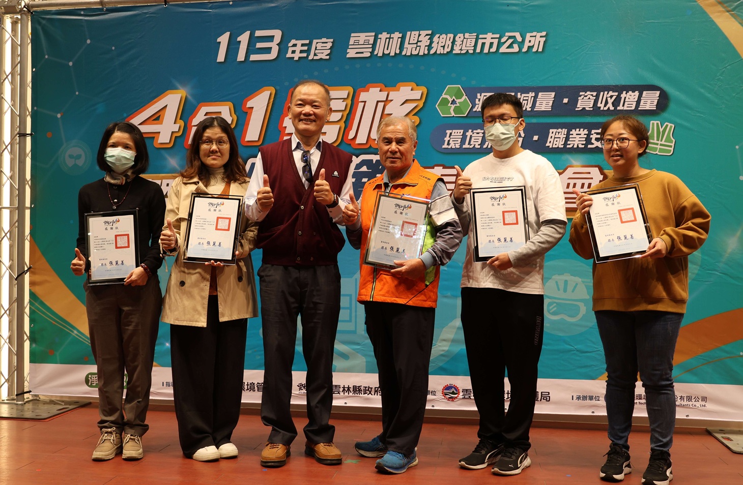 四合一考核前五名為古坑鄉、土庫鎮、斗南鎮、大埤鄉與莿桐鄉,雲林縣環保局頒贈獎座與獎勵金感謝他們的付出與努力。(圖/記者蘇峯毅攝)