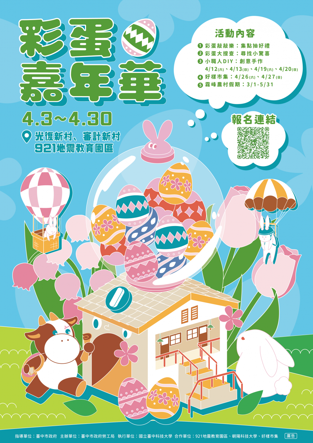 【記者林重鎣台中報導】台中市政府勞工局將於4月在霧峰光復新村舉辦「彩蛋嘉年華」活動,以復活節蓬勃生機與活力為主題,推出一系列包括彩蛋大搜查、小職人DIY、彩蛋敲敲樂,以及彩蛋抽獎等精彩活動,最後一週末更加碼大型扭蛋抽抽樂,並結合「好樣市集」熱鬧登場。勞工局長林淑媛2日表示,此次活動與921地震教育園區合作,出示線上集點頁面可享優惠,此外,霧峰小農也推出農村假期活動,適合親子共遊,體驗深度旅遊樂趣,歡迎民眾春遊光復新村,歡度繽紛彩蛋兒童節!