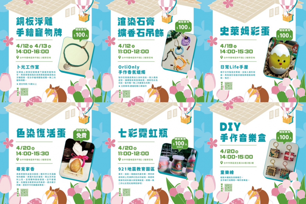 另外,凡在光復新村及審計新村摘星青創店家消費滿100元、參與指定場次職人DIY或購買921地震教育園區門票,均可獲得活動點數,集滿3點即可參加「彩蛋敲敲樂」線上抽獎。