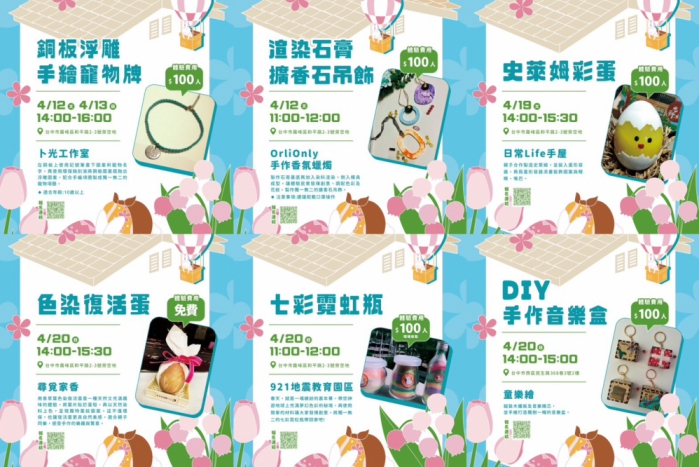 課程時間分別訂於4月12日、13日、19日、20日,依序為渲染石膏擴香吊飾、銅板浮雕、史萊姆彩蛋、DIY手作音樂盒、色染復活蛋以及七彩霓虹瓶等7場有趣的手作體驗,民眾即日起可透過活動網頁線上報名( https://reurl.cc/Dq9lnm ),體驗親子合作的樂趣!