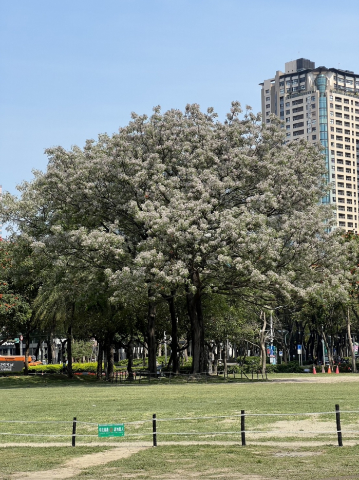 陳大田不藏私推薦,市內多處公園與綠地都能欣賞到苦楝花海,包括西屯區潮洋溪人行道、福科路、環中路與安和路口,以及南屯區楓福公園、公15公園,還有南區興大路與高工路口、復興北路等地。其中,西屯區潮洋溪畔更有一株壯觀的白花苦楝樹,潔白小花層層疊疊,與潺潺溪水、湛藍天空相映成趣,勾勒出優雅動人的春日景緻。