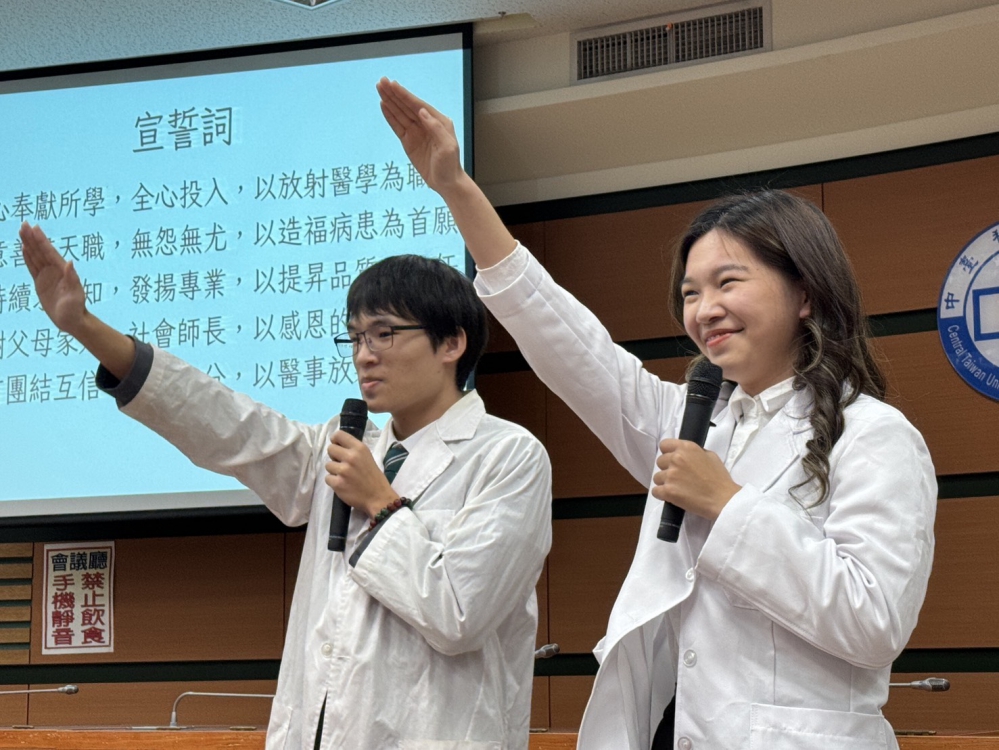 陳錦杏校長在典禮中勉勵即將進入臨床實習的學生,期許大家不僅要堅守以技術專業為本,更要以人文關懷為矩,發揮醫療專業的社會價值,成為具有同理心、敦品勵學的中臺人。醫放系彭炳儒副主任則欣慰地指出,目前臺灣各大醫療院所中,每2位放射師就有一位來自中臺科大醫放系,充分展現醫放系的卓越培育成果,而醫放系畢業生臨床就業率更是達到100%,體現出市場對中臺醫放人才的高度肯定。