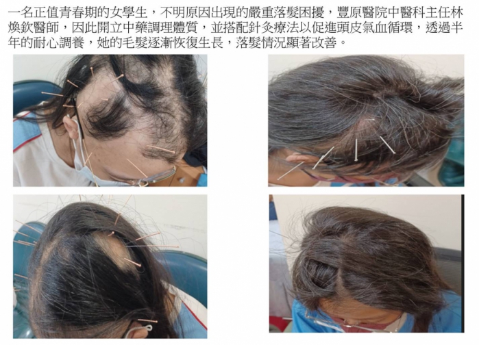 林煥欽舉例說明,一名正值青春期的女學生,不明原因出現的嚴重落髮困擾,使原本茂密的頭髮出現多塊光禿區域,使她的情緒低落,自信心嚴重受損。為了尋找合適的治療方式,家人帶她求診於多家醫療機構,經過抽血檢查與中西醫診斷,並未發現明顯異常,嘗試許多治療或外用生髮產品,效果皆不理想。
