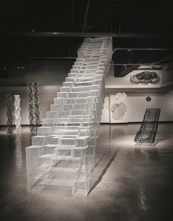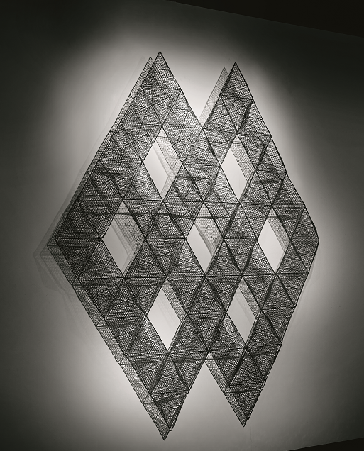 另外,《花系列》將剛硬鋼網的視覺意象轉化成出現柔軟的摺紙花藝,彷彿鐵件也能綻放生命的靈動;歷時數個月完成的《菱形系列》,中間簍空處需精準計量測鋼線的承重力及平衡,皆是體力與技法的高度挑戰與表現。《門框系列》透過複雜的結構設計,配合光線的穿透,讓觀者在不同角度欣賞時,體驗光影幻化的千變萬化。