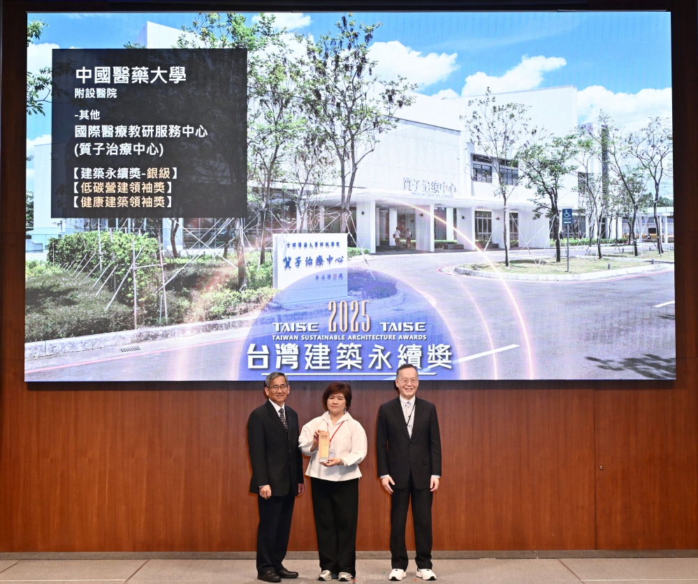 中醫大附醫院長周德陽表示,本次獲得殊榮的「質子治療中心」充分融合自然環境與人文地景,兼具綠能、低碳的醫療建築,是中部地區首座質子治療設備,亦是融合永續精神與醫療專業的代表之作。自規劃初期即導入永續設計理念,包含芬多精負離子浮力通風系統、地冷系統、低碳智慧節能屋頂與光電再生能源系統,不僅有效降低能源使用與碳排放,同時兼顧建築美學與使用者舒適性。本院亦持續強化數位科技導入、提升醫療照護的品質與效率、便捷整體的就醫流程,更進一步發展遠距醫療系統,成功打造符合健康、智慧、永續三重標準的優質綠色醫療場域。