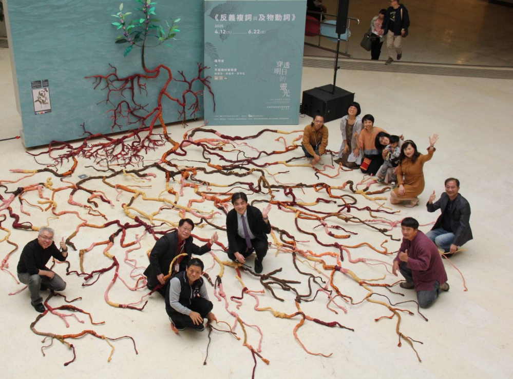 【記者張原銘、張皓傑台中報導】廢材變身大型根系植物裝置藝術!台中市政府文化局13日於大墩文化中心辦理「穿透明日的靈光-SDGs永續藝術系列特展」第二檔《反義複詞與及物動詞》的開幕式,藝術家楊芳宜與三所特教學校學生合作,將廢棄材料轉化為藝術,並以台中特有的「大安水蓑衣」為意象,創作出大型根系植物裝置,為開幕式帶來震撼視覺效果。展期至6月22日,歡迎民眾參觀。
