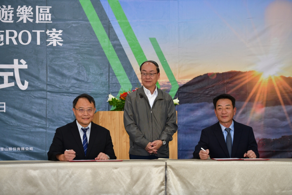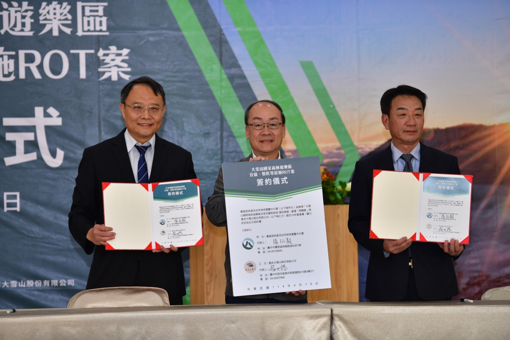【記者張原銘、張皓傑台中報導】林業及自然保育署臺中分署長張弘毅與惠來企業旗下的惠來大雪山股份有限公司董事長顏世陸,15日正式進行「大雪山國家森林遊樂區住宿餐飲等設施增改修建、營運移轉案」簽約儀式,委託營運10年,雙方將攜手推動大雪山國家森林遊樂區之觀光發展、低碳生態旅遊及環境教育等多元目標。