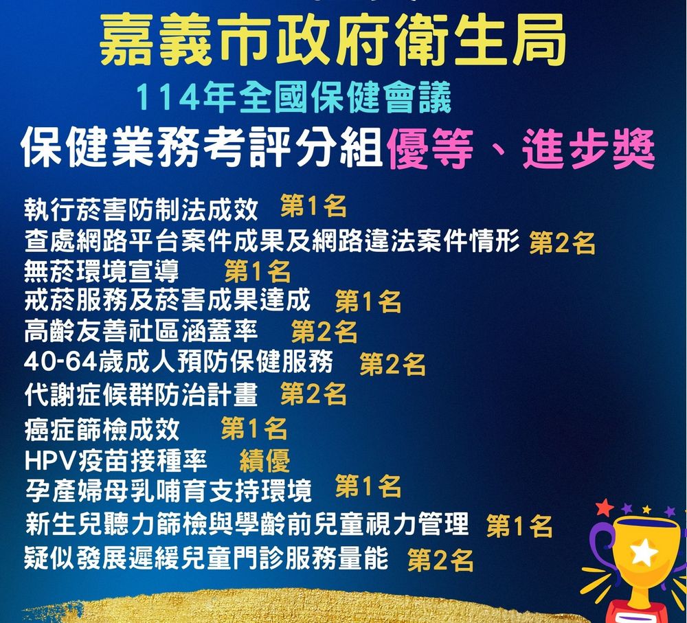 嘉義市衛生局表示,衛生福利部國民健康署表揚保健業務推動績優縣市,榮獲執行菸害防制法成效、查處網路平台及網路違法案件、無菸環境宣導、戒菸服務及菸害成果達成、高齡友善社區涵蓋率、40-64歲成人預防保健服務、代謝症候群防治計畫、癌症篩檢成效、HPV疫苗接種率、孕產婦母乳哺育支持環境、新生兒聽力篩檢與學齡前兒童視力管理、疑似發展遲緩兒童門診服務量能等獎項,基層同仁平日的辛勞終獲肯定。