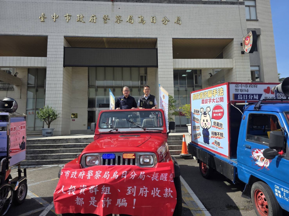 【記者林重鎣台中報導】為提升民眾防詐意識,臺中市政府警察局烏日分局特別策劃一場別開生面的「創意反詐宣導活動」。17日上午由分局長劉雲鵬親自率領烏日分局反詐小天使,搭乘繽紛吸睛的吉普車與宣傳車、宣傳機車,繞行轄內各重要路段及熱點區域,以行動化方式深入社區貼近民眾進行反詐宣導。