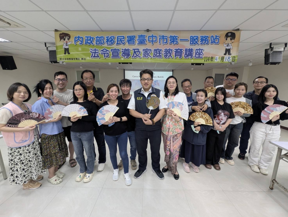 移民署臺中市第一服務站主任王驥表示,每把扇子都蘊含兩人攜手合作的心意,透過對彼此文化的理解,能為新住民夫妻建立良好的溝通模式與增進彼此的親密關係,祝福新住民朋友未來在臺灣與家人攜手前行,找到各自的歸屬與幸福。