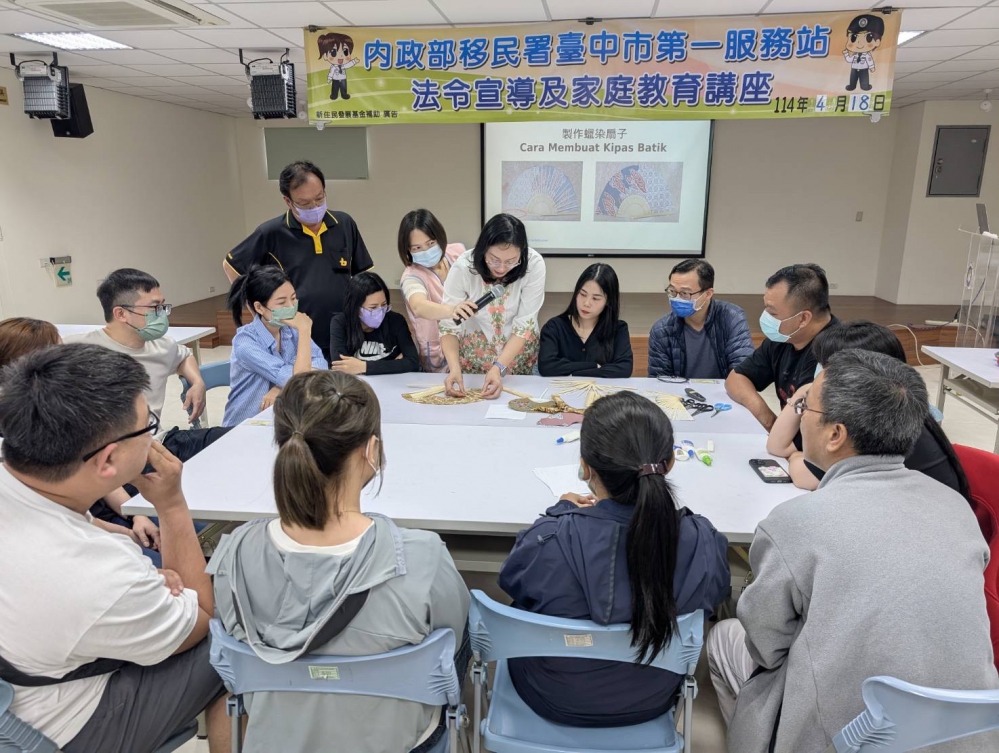【記者張原銘、張皓傑台中報導】移民署臺中市第一服務站日前辦理以印尼文化為主題的家庭教育活動,邀請初次依親來臺的新住民及配偶參與,以增進夫妻間的情感交流。本次活動除分享印尼文化特色外,並使用印尼獨具特色的「蠟染布」讓學員們動手做「蠟染團圓扇」,夫妻攜手共同完成一把別出心裁的扇子,象徵婚姻是每對夫妻間獨特的「善」緣,可以攜手到白頭。