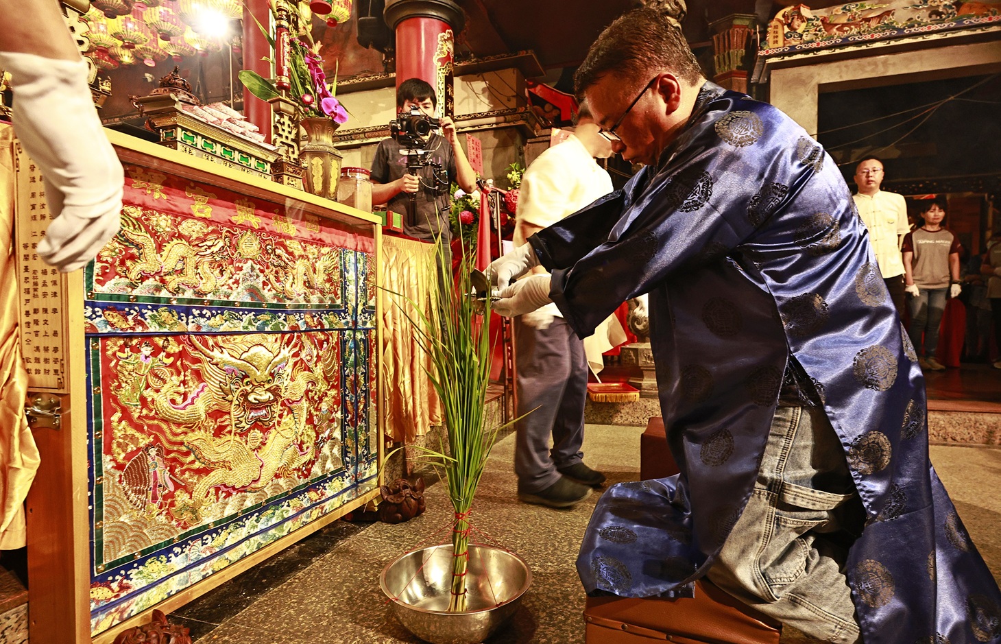 西螺福興宮董事長楊文鐘身穿長袍馬褂,恪守古制依傳統古禮三獻祀典儀式獻祭叩拜。