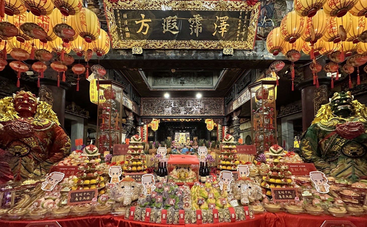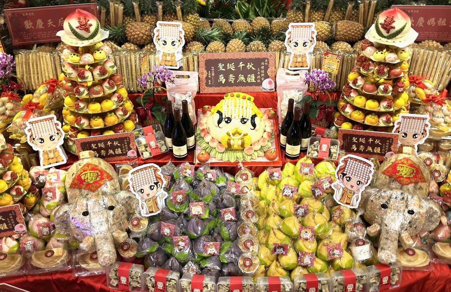 除傳統鮮花、果品、壽麵等祭品外,信眾發揮創意,帶來各式別出心裁的賀壽供品,包括媽祖造型的母子壽桃、沙其馬裝置藝術、八層小型壽桃塔、精緻米糕龜、西式蛋糕、馬卡龍與馬琳糖,甚至還有棉花糖製作的三牲組合,展現信仰與創意的完美結合。