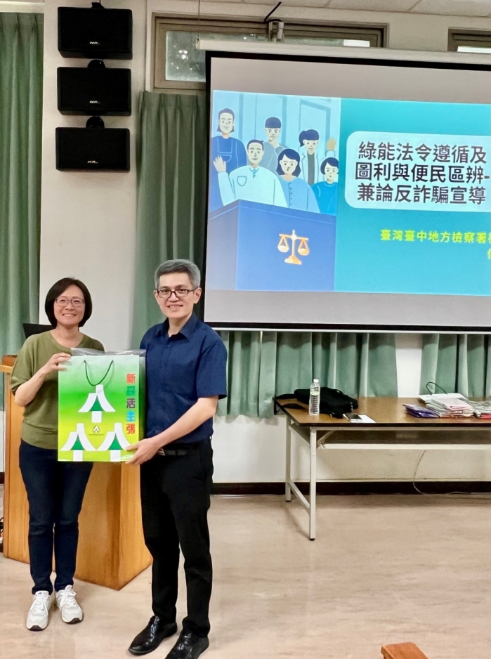 【記者張原銘、張皓傑台中報導】林業及自然保育署臺中分署日前舉辦「綠能法令遵循及圖利與便民區辨兼論反詐騙宣導」廉政講堂,邀請台中地方檢察署何建寬檢察官以實際案例針對圖利罪構成要件、便民的意涵深入解析,讓分署同仁、合作廠商釐清依法行政與便民服務的界線,共同提升廉潔效能與公務信任。