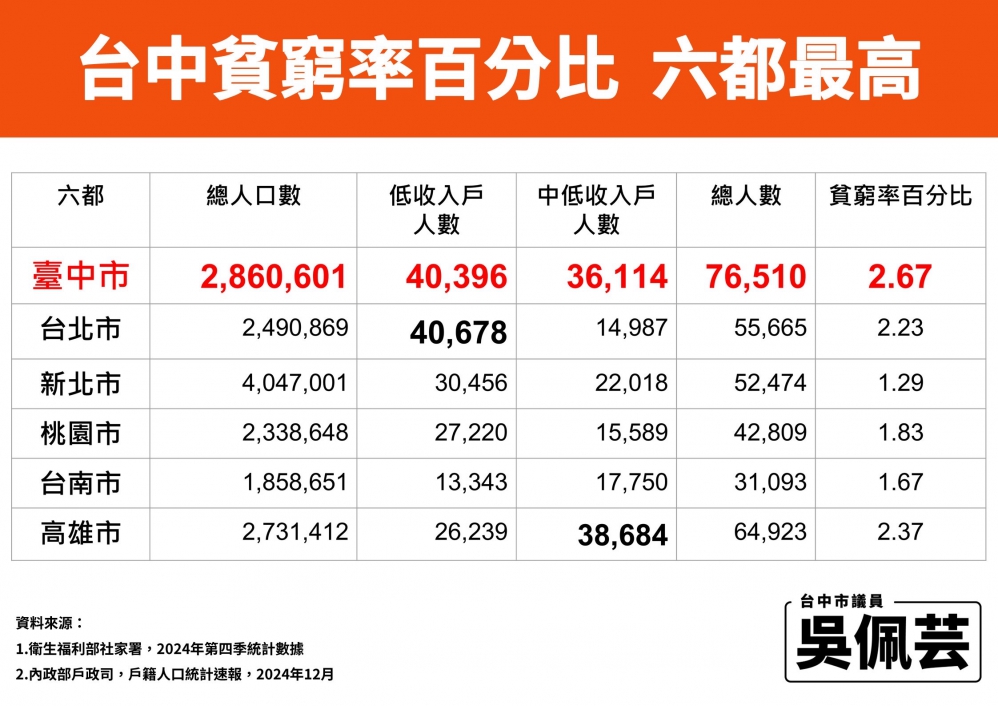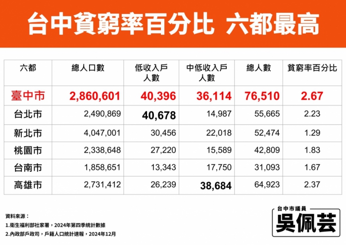 吳佩芸強調,依照衛福部社家署2024年底第四季的統計數據,台中市的低收入戶人數比台北市略低、中低收入戶人數比高雄市略低,都是第二名。但台中市貧窮人口比例卻不減反增,躍昇至六都最高。