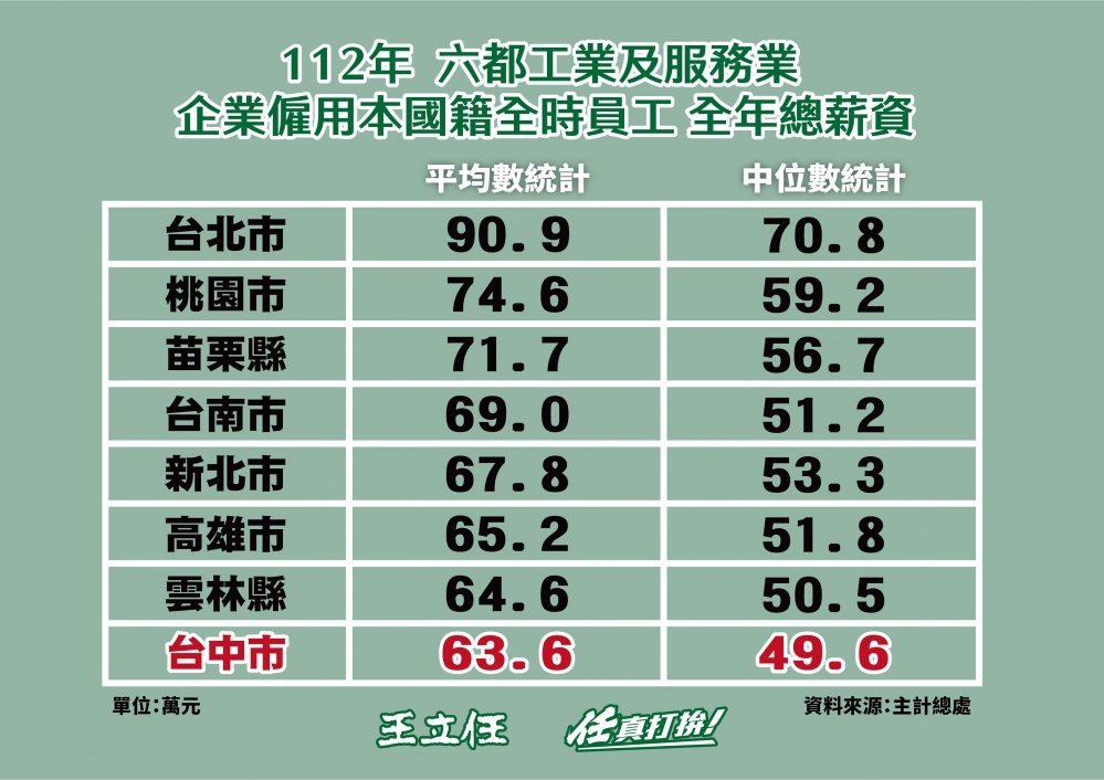 王立任質疑市府,台中市2023年全年總薪資平均數僅63.6萬元,甚至低於雲林的64.6萬和苗栗的71.7萬元,台中在全球產業快速變革的同時,市府應該要儘速推動產業轉型。