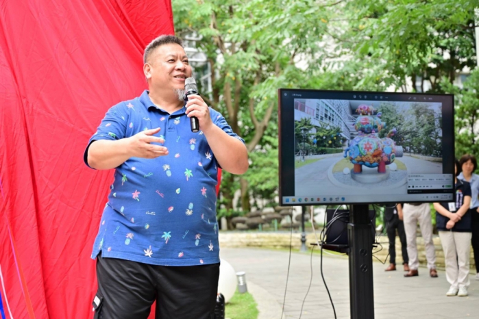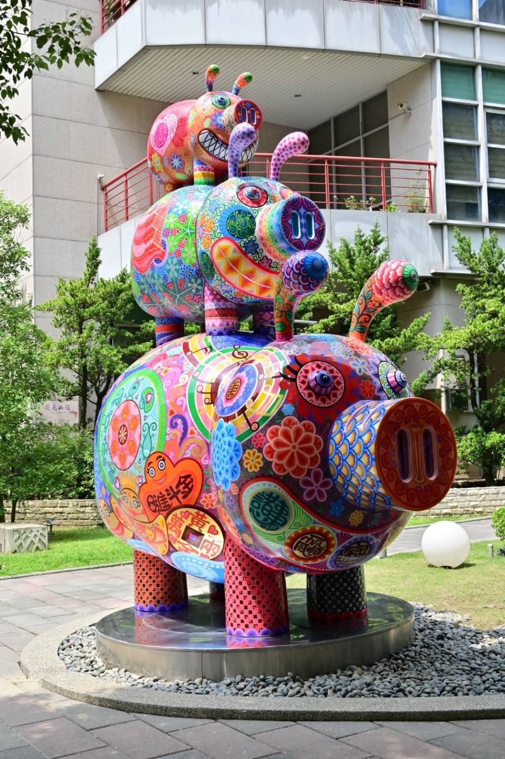 洪易說,此次展出作品,是以三隻風格鮮明的小豬,傳達「三陽開泰」、「團圓喜氣」的意象,融合台灣民俗意涵與現代雕塑風格。作品長335公分、寬175公分、高388公分、重達892公斤,色彩繽紛、造型活潑,搭配地稅局前庭的綠意盎然,格外吸睛,為公共空間注入生命與趣味,也激發市民對生活的美好想像。
