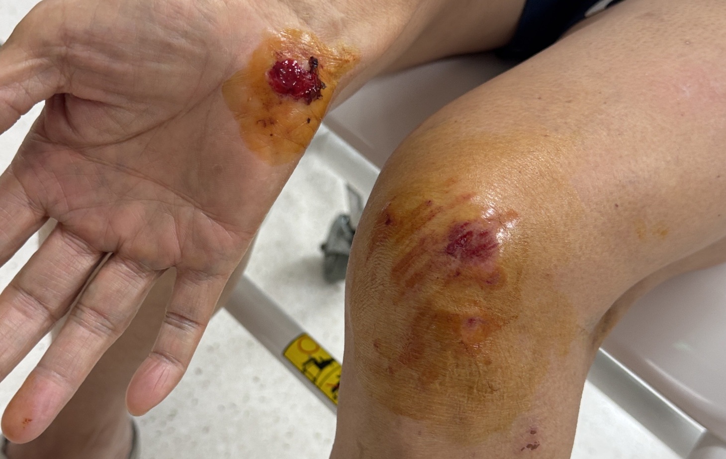 經X光初步檢查雖無明顯骨折,但因臉部腫脹與膝蓋瘀青腫痛情況嚴重,醫師建議於5月1日回診。