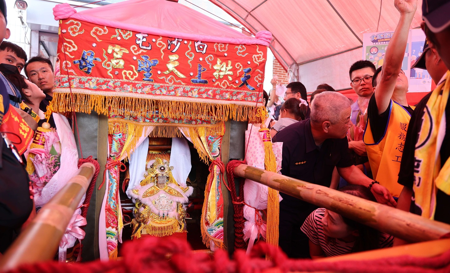 縣長張麗善率縣府團隊與地方官員一同在北辰派出所迎駕,虔誠接轎祈福,期盼媽祖庇佑台灣國泰民安、世界和平,百姓安居樂業。(圖/記者蘇峯毅攝)