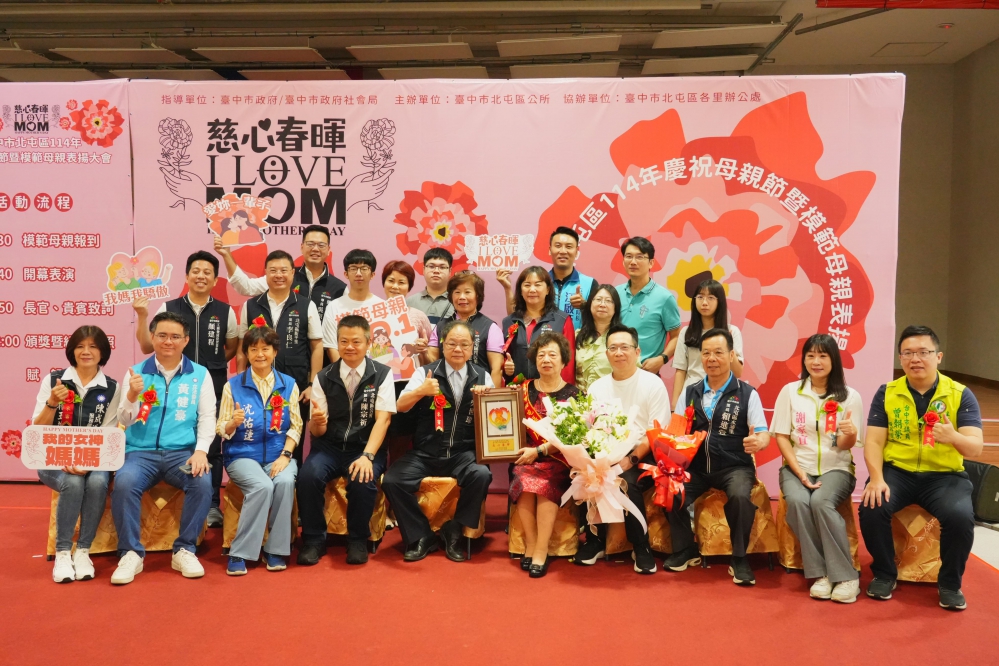 北屯區114年度台中市慶祝母親節曁模範母親表揚活動,由令人振奮的太鼓表演與優美柔雅充滿韻味的旗袍舞中揭開序幕,現場氣氛溫馨歡樂,包括立委黃健豪、市議員沈佑蓮、曾朝榮、謝家宜、賴順仁、民政局長吳世瑋、北屯區長陳宗祈、運動局專員吳宗學、工策會幹事顏建程、北屯區里長聯誼會長賴天權及在地各里長均到場祝賀,立法院副院長江啟臣、市議員陳成添也派員致意。