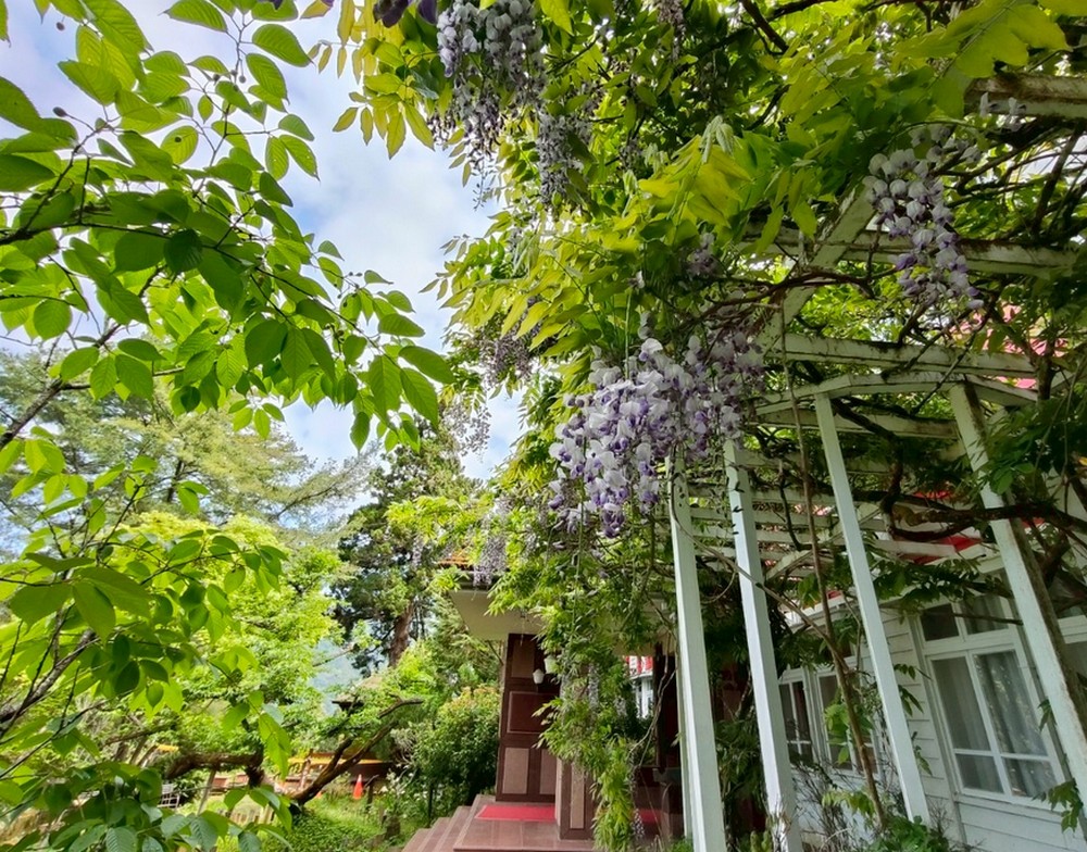 浪漫五月天,阿里山賓館1913舊事所前紫藤花盛開。(圖/阿里山賓館提供)