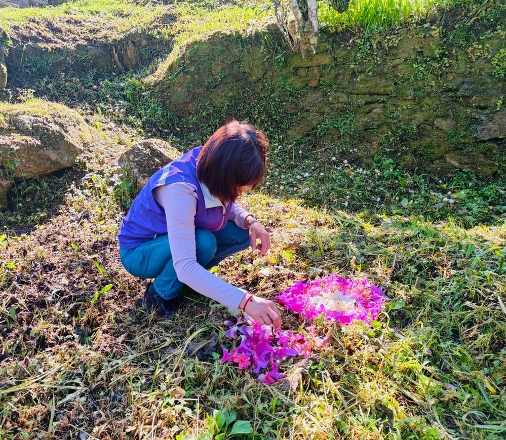 賓客在沼平公園撿拾杜鵑花的落花進行,曼陀羅陣創作。(圖/阿里山賓館提供)