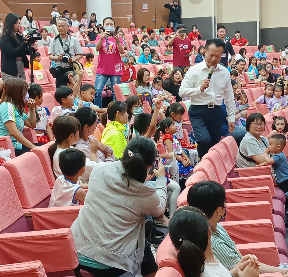 翁章梁縣長親自到創意洗手舞比賽現場,與小朋友們熱情互動有獎問答。(圖/記者任芳葵攝)