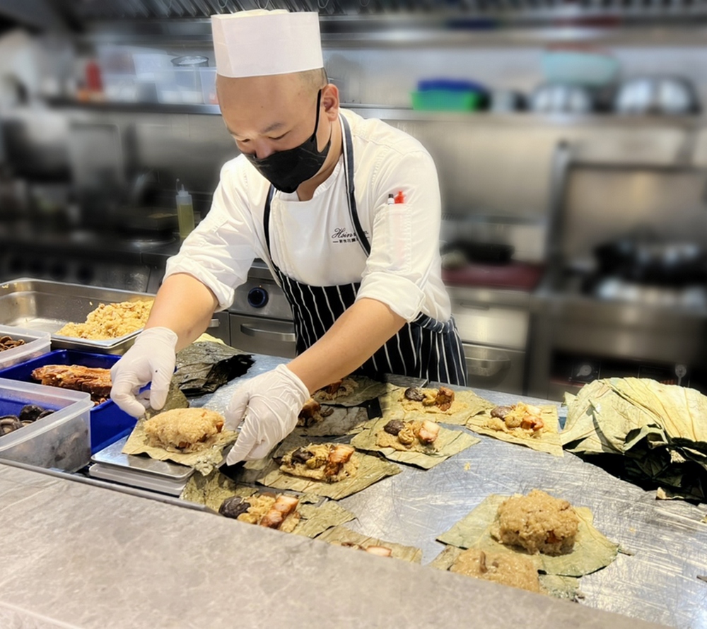 新悦花園酒店主廚團隊遵循正統廣式工法,純手工限量製作「極品廣式粽」。(圖/新悦花園酒店提供)新悦花園酒店招牌餐廳「頤粵軒」,擁有專業的環球廚神主廚團隊,以精湛手藝呈現道地粵式滋味,廣受在地與外地饕客推崇。像招牌的嘉南稻草西施牛、大漠脆皮風沙雞、黃芥末金磚燒肉、北菇吉品鮑撈麵,手工港點-鵪鶉溏心蛋燒賣、小龍奶皇流沙包、菠蘿流沙糯米滋、塔香煎蝦餅、楊枝甘玉露、古法杏仁茶…等, 從大菜吃到甜點,鮮活海鮮吃到手工港點,道道融合經典與創新。