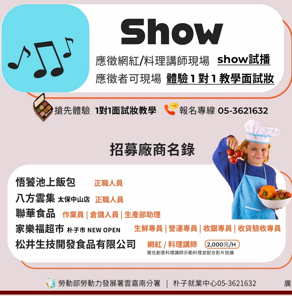 (記者任芳葵嘉義報導)勞動部勞動力發展署雲嘉南分署朴子就業中心為協助待業者順利就業,促進需照顧家庭、有彈性工時需求的婦女重返職場,將於5月9日(星期五)下午2時至4時在朴子市公所多功能會議室,舉辦「食尚新星招募會×網紅大主播」母親節現場徵才活動,積極推動「婦女再就業計畫」及「55+就業獎勵」,精心安排一對一彩妝教學,讓婦女們華麗登場迎接面試。