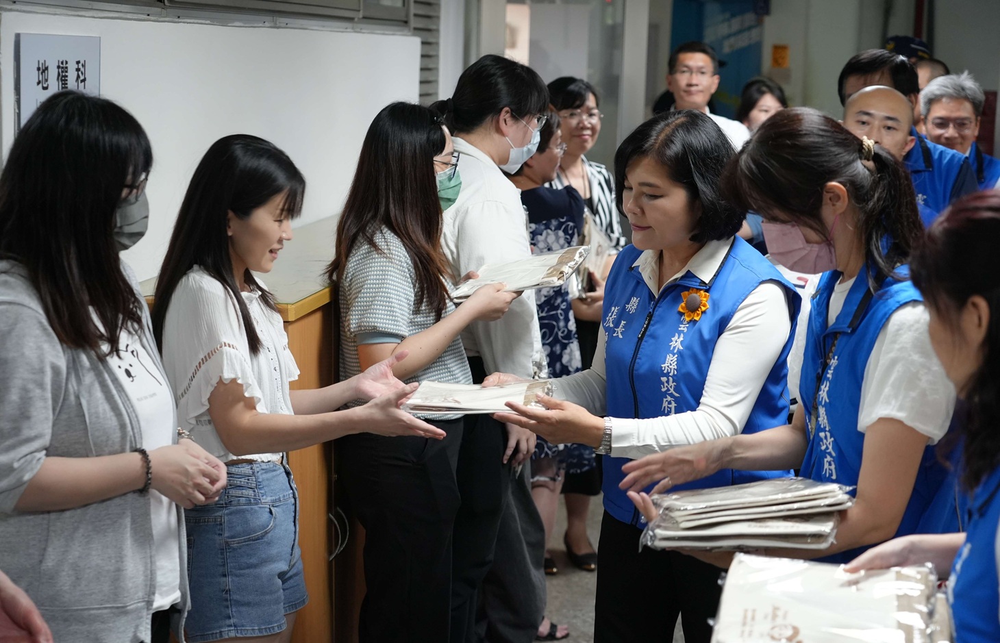 縣長張麗善、副縣長謝淑亞親自前往各局處發放母親節禮物,祝福女性同仁母親節快樂。