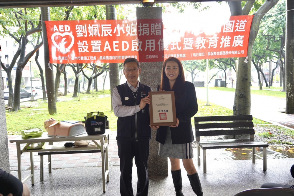 過去已於湧泉公園、秋紅谷、洲際棒球場等人流密集場所設置AED,並領先全國導入防水型戶外設備,提升全天候應變效能。此次劉女士自發性捐贈AED,不僅補強美術園道的緊急救護能量,更凸顯市民主動參與公共安全的良善意識,也為市長盧秀燕推動的「幸福宜居城市」願景注入溫暖且具體的力量。
