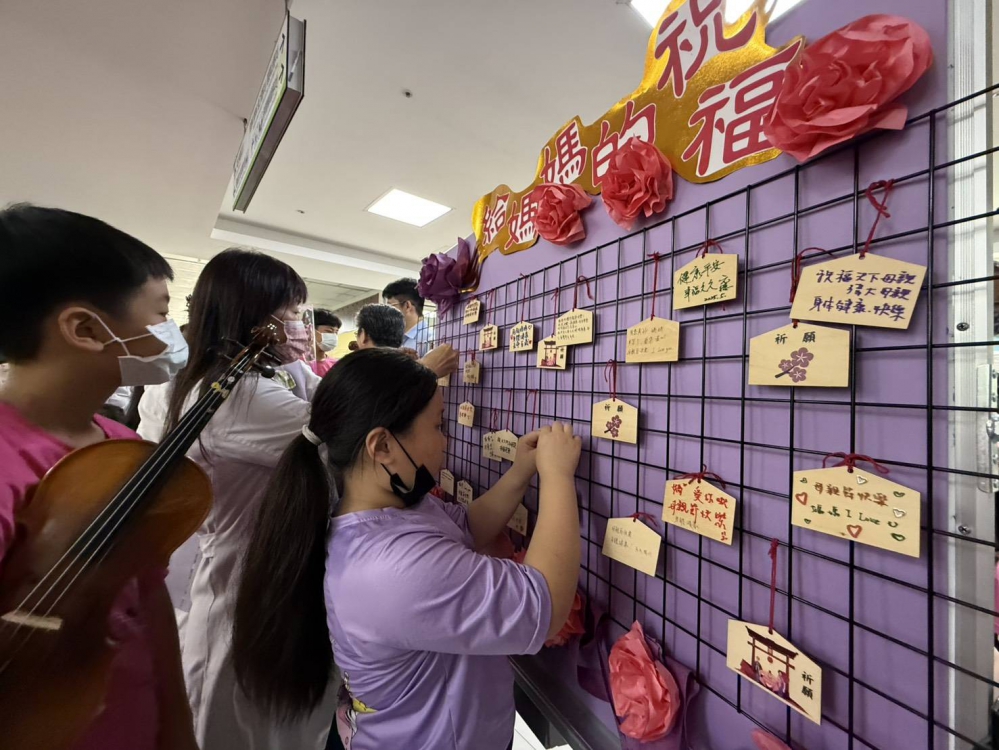 院方今天除了準備豐富的音樂饗宴,還有母親節應景的康乃馨與小蛋糕,以及祈福小卡片,黃元德院長與廖妙淯副院長也邀請現場與會的貴賓與家屬,一起填寫祈福卡,將對母親的祝福綁上祈福牆,卡片中除了「媽媽我愛妳」、「母親節快樂」等常見祝福語,還有「努力減肥」的俏皮祝福,讓現場更添歡樂氣氛。