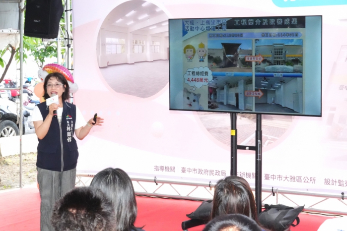 民政局長吳世瑋指出,大雅區人口數已達9.5萬人,逐步邁向10萬大關,原僅一層樓的社區活動中心,已無法滿足社區發展協會與里辦公處的活動需求,感謝立委楊瓊瓔、市議員吳呈賢及前議員吳顯森積極反映地方心聲,市府積極籌措經費增建,並感謝在地議員蕭隆澤、羅永珍、賴朝國、徐瑄灃、周永鴻及吳建德對預算的支持。