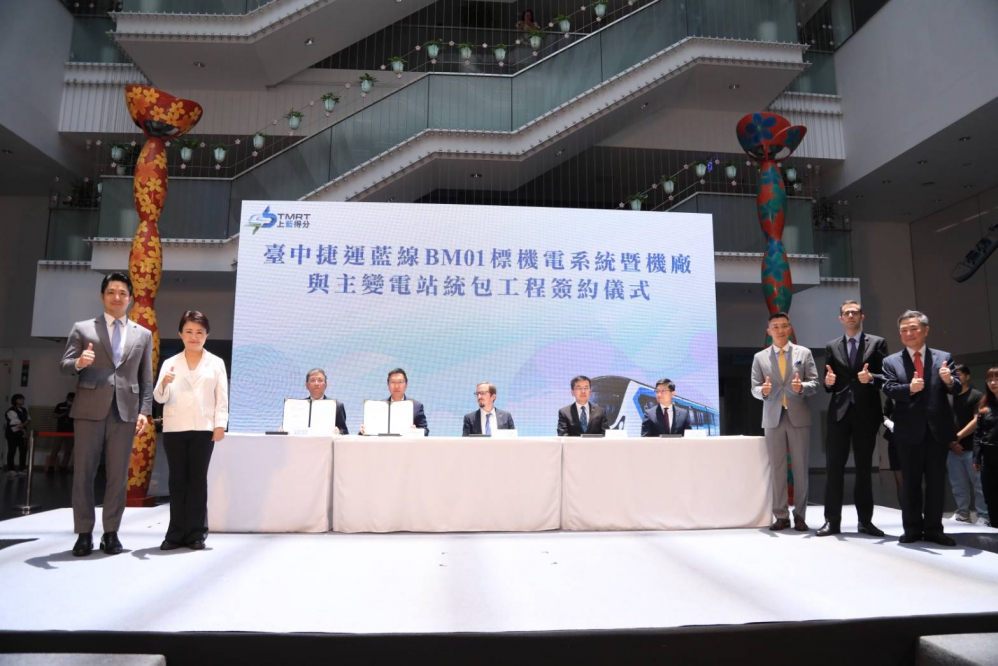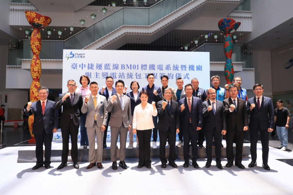 今日簽約儀式在市府台灣大道市政大樓舉行,由台中市府捷運工程局長蘇瑞文與新加坡科技電子有限公司總裁趙文良、阿爾斯通運輸股份有限公司東亞地區務董事 MR. Toby Tiberghien、中鼎工程股份有限公司總經理李銘賢、現代樂鐵股份有限公司資深副總裁金正勳進行簽約。由於此次機電標工程由法國、韓國、新加坡及我國共同合作打造,因此也特別邀請新加坡駐台北商務辦事處代表葉偉傑、法國在台協會主任龍燁(Franck Paris)、駐台北韓國代表部代表李殷鎬到場一同見證。