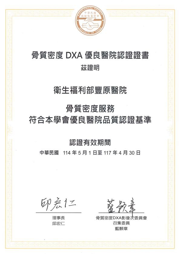 此次獲獎代表豐原醫院骨質密度檢查DXA檢查在設備精準度、報告時效與臨床應用上皆達到優良等級。張家豪主任補充:「我們除了確保儀器準確性外,也積極針對高危險族群主動進行篩檢,並與骨科團隊密切合作,讓每位病人獲得從預防到治療的完整照護。」