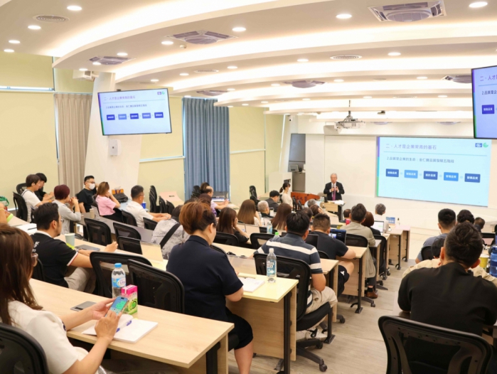許勝雄也提到金仁寶「細胞分殖」的組織型態,每一位員工都是一個可以自主成長的細胞,企業要提供土壤,讓他們茁壯。他說明「企業可以家庭化,但不能家族化」,清楚界定了情感文化與專業制度的分界。他同時分享金仁寶如何落實ESG、推動數據治理、減碳行動,以永續思維作為核心決策依據。「企業不是為了對抗未來,而是要與未來共同設計秩序。」許勝雄強調。