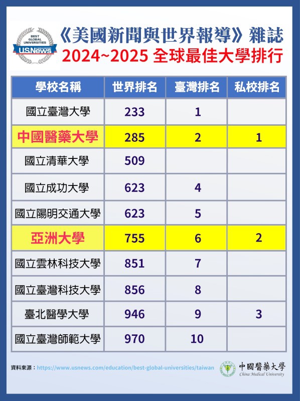 近年來校務的發展與辦學績效屢獲國內外肯定,榮獲《英國泰晤士高等教育特刊THE》《2025年世界最佳大學排名》全球第319名,台灣第2,僅次於台大,私立大學第1,在「2025年亞洲大學排名」全亞洲第66名,僅次於臺大,全臺第2以及榮獲《美國新聞與世界報導US News》《 2025年全球最佳大學排名》全球第285名,台灣第2,僅次於台大,私立大學第1;相信每位校友都對中醫大這塊閃亮的招牌,引以為榮為傲。