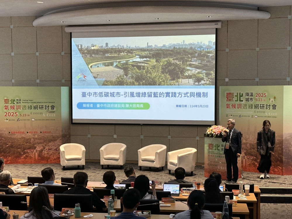 【記者林獻元台中報導】面對都市高溫與極端氣候挑戰,台北市政府23日舉辦「2025年台北降溫城市氣候調適綠網研討會」,邀集產官學界專家共議調適策略;其中台中市建設局長陳大田獲邀出席專題座談,分享「引風增綠留藍」的實踐成果,並介紹「美樂地計畫3.0」的核心理念與成功關鍵,展現台中推動低碳永續、打造韌性城市的前瞻作為,獲與會專家熱烈回響。