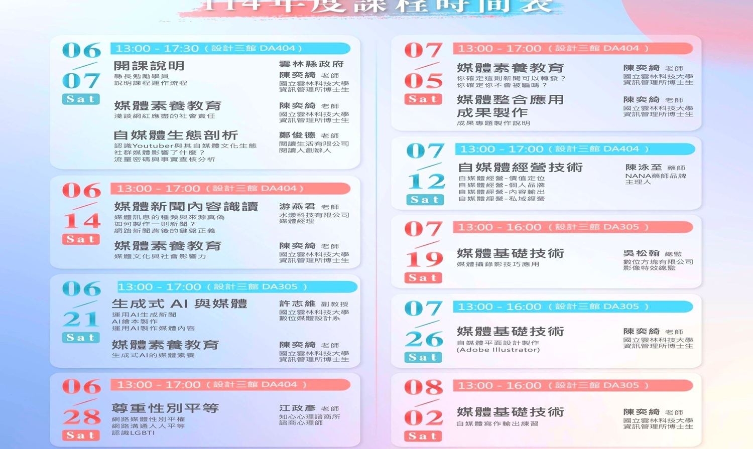 【記者蘇峯毅/雲林報導】因應數位時代媒體環境劇變與假訊息頻傳的挑戰,雲林縣政府與國立雲林科技大學攜手舉辦《雲林自媒-114年雲林縣媒體素養暨自媒體經營訓練》,旨在強化在地公民的媒體識讀力與自媒體實作能力,課程即日起開放報名,招收30名學員,名額有限,額滿為止。課程自6月7日至8月30日於雲科大辦理,全程免費。