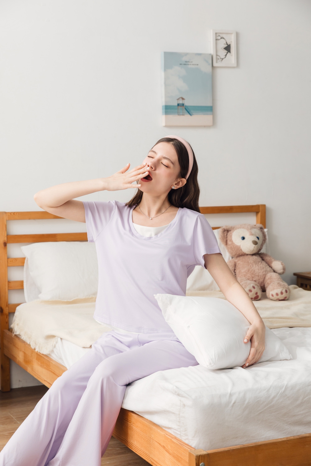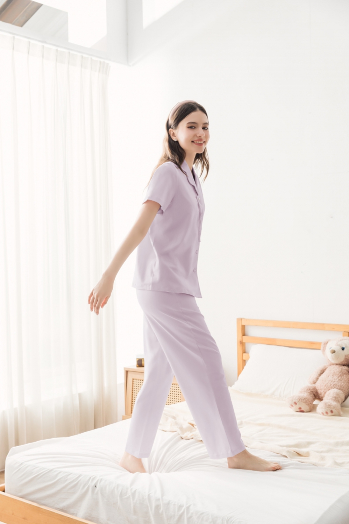 另款短袖+長褲組高品質花瓣領珍珠釦財團千金款高質感設計,寬鬆版型微彈輕盈舒適,修身好眠。