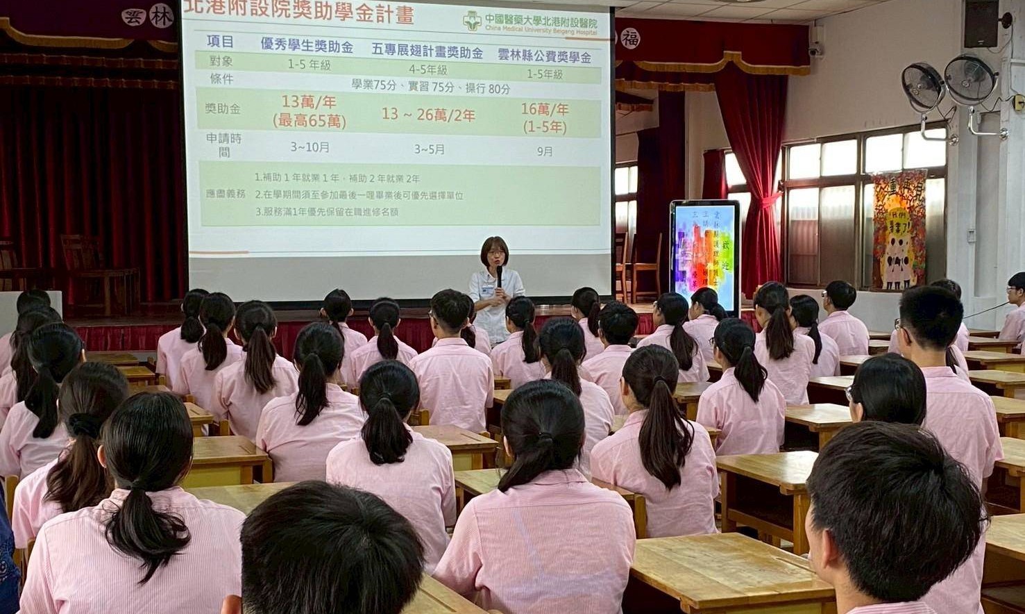 【記者蘇峯毅/雲林報導】在醫療需求持續攀升的當下,醫事人力資源短缺的問題愈加嚴峻,迫切需要有效的解決方案。為因應這一挑戰北港媽祖醫院主動結合在地專辦藥學護理的巨人高中進行深度合作,今雲林縣護理師護士公會理事長廖惠娟蒞臨巨人高中辦理一場提升偏鄉地區醫療與留住人才的講座,並提供優渥的獎助學金,積極致力於培育優秀的在地藥師、護理師及醫事人才,進一步推動醫療服務的整體提升與發展。