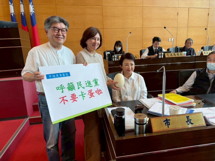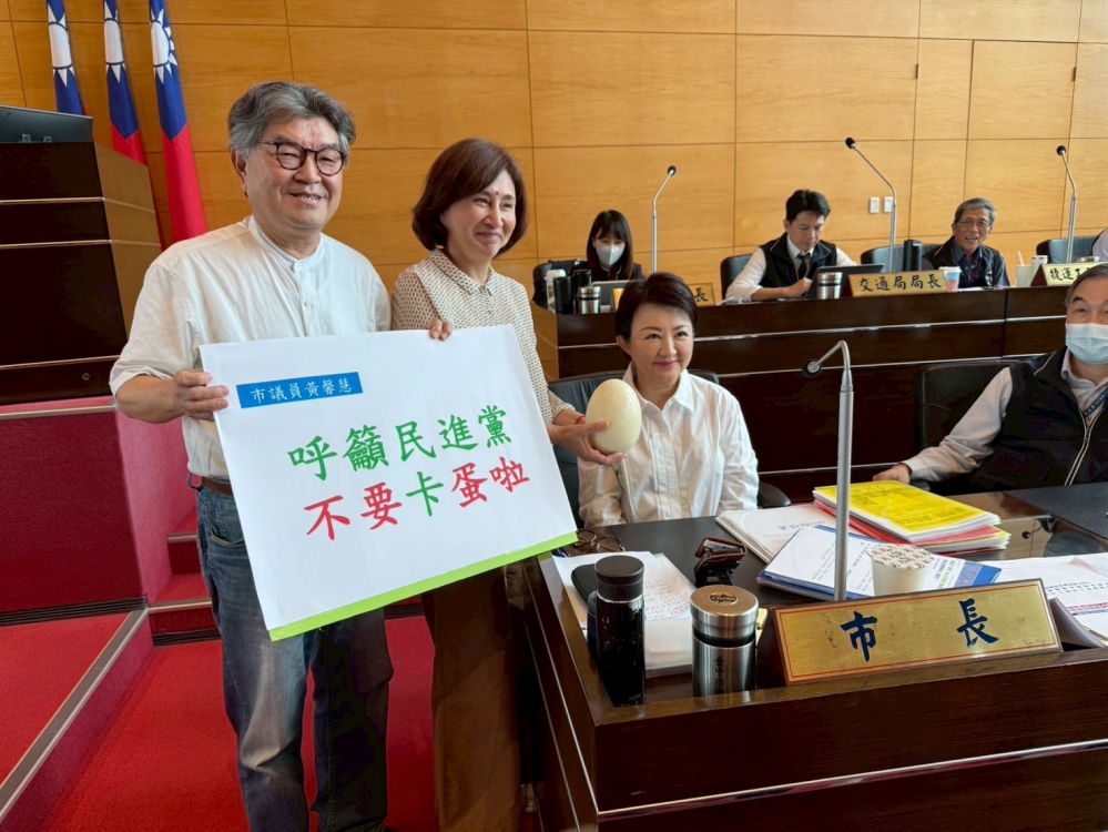 【記者林獻元台中報導】水湳經貿重大工程,歷經三屆市長,陸續在市府團隊努力完工!國民黨台中市議員黃馨慧4日在議會進行市政總質詢表示,台中各項重大工程,前朝只負責「改名一條龍」、工程進度零。盧市長上任後,秉持「開工與完工」理念,「綠美圖」、「會展中心」皆克服困難完工,轉運中心進度達79%,另外還加碼興建「大巨蛋」,順利點亮台中建設。隨即拿出一顆巨型蛋,送給盧秀燕祝福後續大巨蛋規畫開工順利,並呼籲民進黨別再「卡蛋」啦!