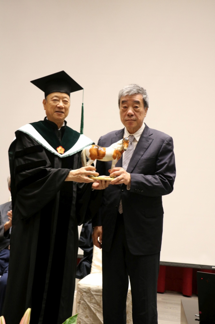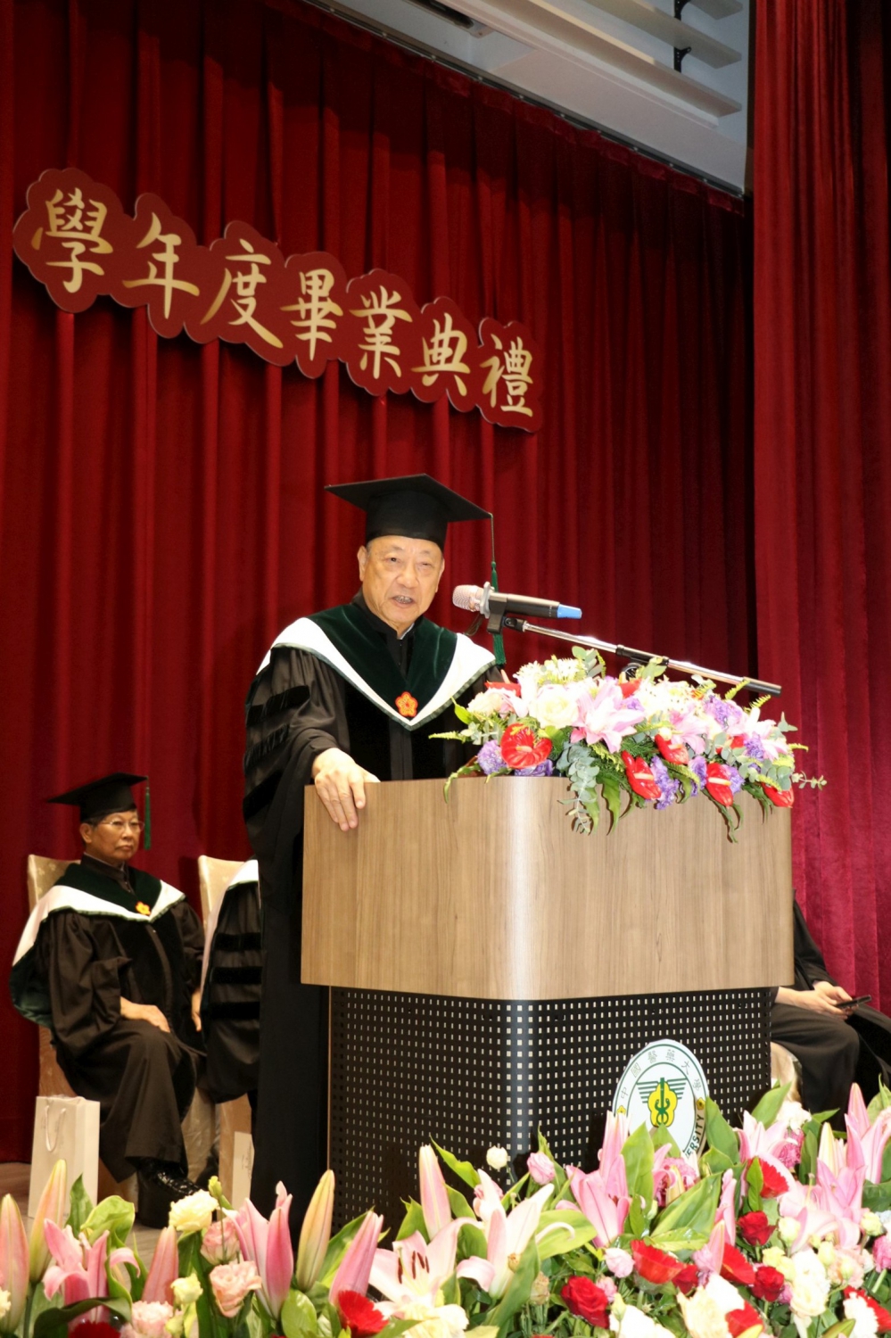 洪明奇校長致詞祝福畢業同學,不論在職場上或在學術研究的路上,每天都要超越自己往前邁進,傳承校訓「仁、慎、勤、廉」之精神,信守視病猶親、修己善群、Stay hungry. Stay foolish(求知若渴、虛懷若愚)終生學習的素養,成為一生做人處世的準則,相信大家可以創造偉大世代,因為有你,世界更美好!