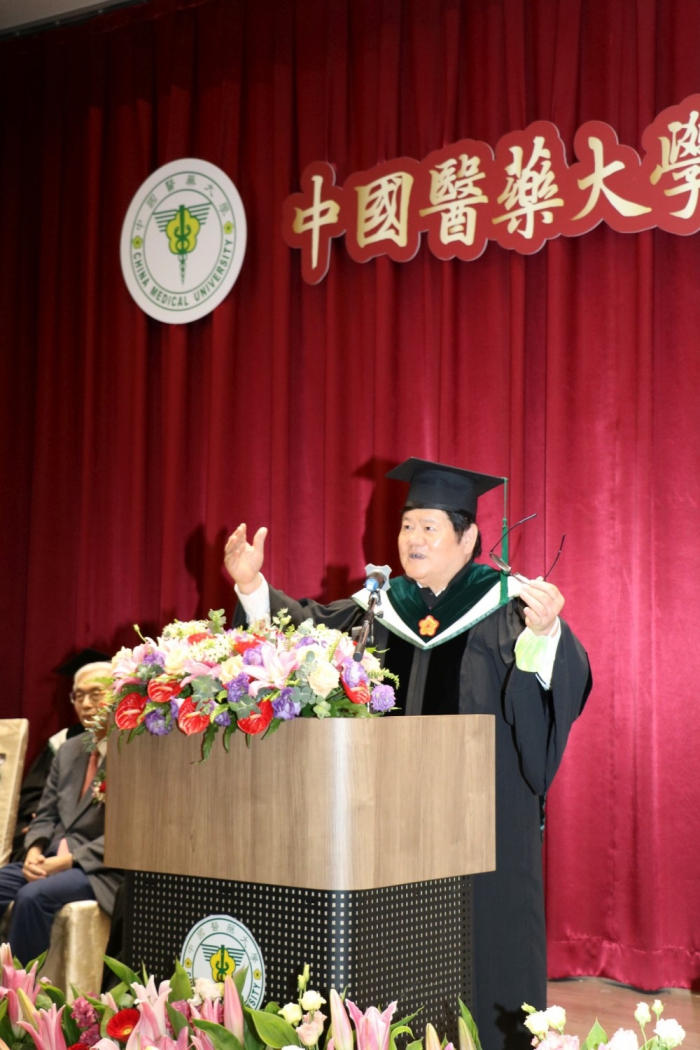 中國醫藥大學暨醫療體系董事長蔡長海致詞時,勉勵同學用開放的心態和積極的行動,主動學習和適應改變,勇敢嘗試新的事物,「擁抱變革」提升自己的競爭力。其次,要有「積極創新」的精神,做一個「領導者」而不是「追隨者」,學習不同領域的知識,才能具備解決問題的能力,找到新的解決方案,創造新的應用。尤其要努力「追求卓越」,全力以赴,卓越是一次要比一次變的更好,永遠追求更好,才能創造不平凡且成功的人生!