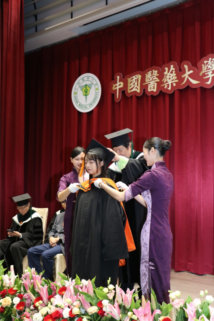中國醫藥大學今年畢業典禮主題:『傳承醫心,勇敢逐夢Inheriting the medical spirit and bravely pursuing dreams』,在水湳校區國際會議廳會場佈置典雅溫馨,由研究生事務長余永倫教授雙手持著象徵學術地位與榮譽的本校的「權杖」,伴隨著合唱團悠揚動聽的歌聲,帶領導各學院院長和師長們進場揭開序幕,全校9個學院20個學系、38個碩士班、22個博士班,有大學部畢業生1257人、碩士267人、博士91人;洪明奇校長親自替畢業同學授袍、撥穗,並頒發研究生獎陳信湖等17人,德育獎吳皆德等29人,智育獎蘇豐恩等77人,體育獎李湘晴等4人,服務獎林軒浩等18人,柳川青年獎陳彥伃等3人,英才獎劉奕宏等14人,杏林獎陳柏融等3人。校院師長與家長數百人在場分享子女榮獲學位的榮耀,也為自己留下一生最美好記憶,氣氛歡愉溫馨洋溢。