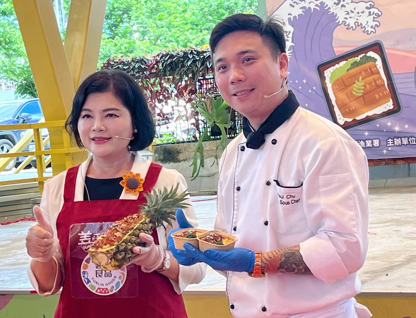 ▲張麗善縣張與朱昱瑋主廚,以當令雲林鳳梨示範「鰻魚鳳梨炒飯」與「漬鳳梨鰻魚飯」創意佳餚。