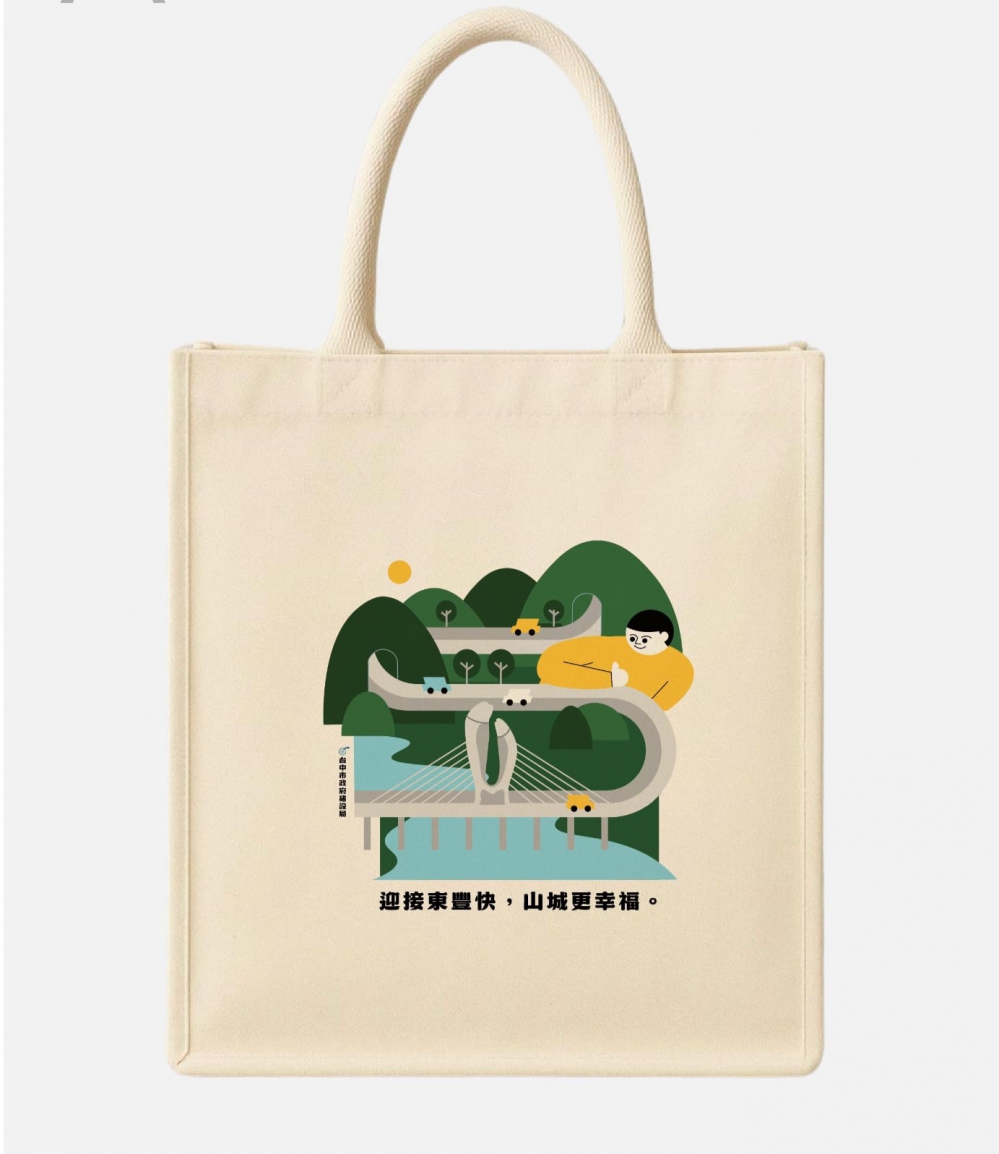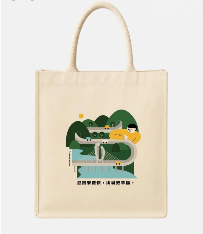 陳大田進一步說明,這次提袋設計,將這硬挺的工程轉化為柔性的生活美學,以插畫呈現橋與山城的連結。提袋圖中從山邊升起的太陽,與穿著黃色衣服的男孩,同以黃色表現象徵建設局溫暖、不畏辛苦、守護山城的決心。